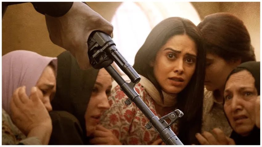 Akelli, a film starring Nusharrat Bharuccha centres around the life of an Indian girl stuck in a war zone and her life’s goal at that time is to escape safely from what seems to be an Islamic terrorist state. There are men with guns outside and scared women in hijab encaptured by those men.