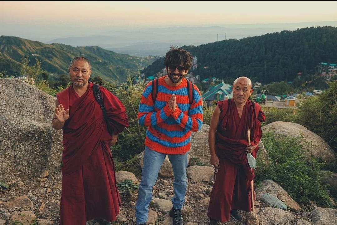 Kartik Aaryan posts an adorable picture as he travels and poses with local monks